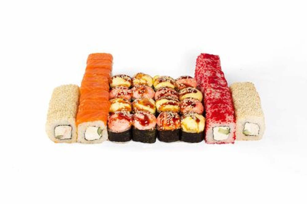 Ролл «Филадельфия лайт» с огурцом, ролл «Калифорния» в кунжуте, ролл «Афина», ролл «Запечённая кура», ролл «Запечённый томаго»