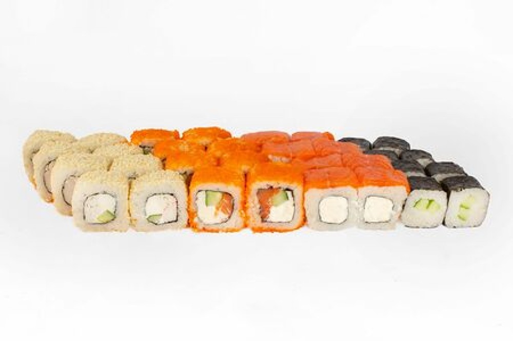 Ролл «Просто филка», ролл «Калифорния» с лососем, ролл с огурцом, ролл «Калифорния» в кунжуте, соевый соус, имбирь, васаби, палочки на 2 персоны
