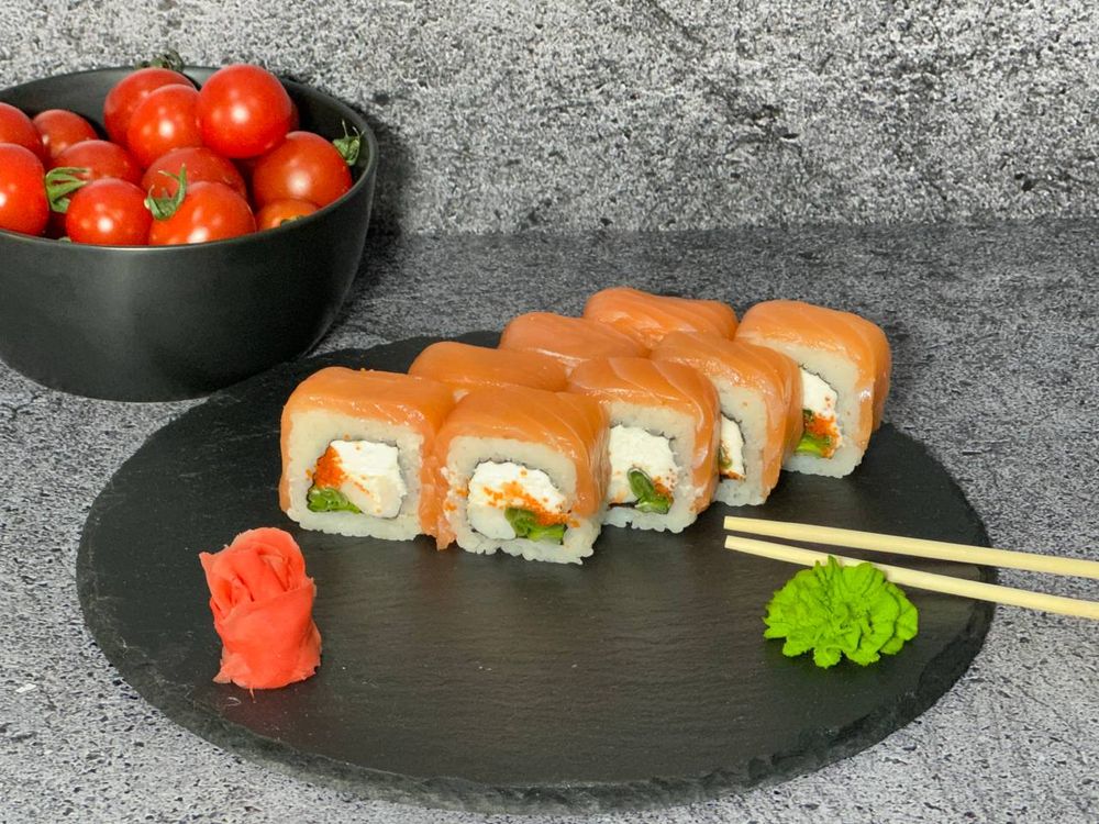 Рис, нори, сыр, лосось, лук зеленый, креветка тигровая, икра тобико