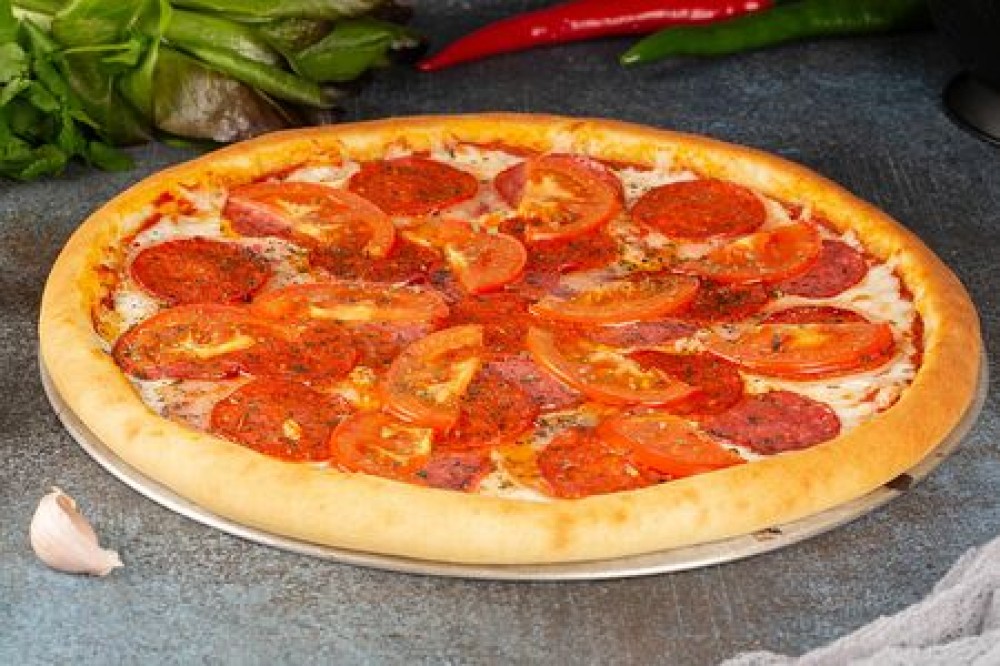 Ветчина, салями, пеперони, томаты, фирменный соус, сыр