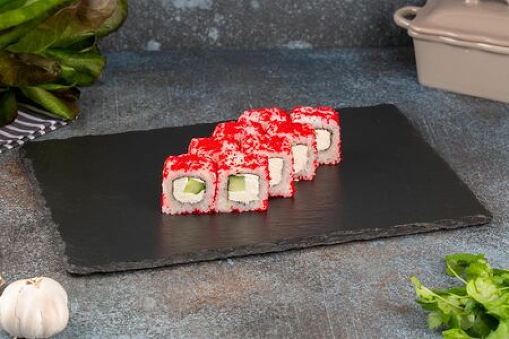 Рис, креветка тигровая, сыр, лист салата, икра тобико